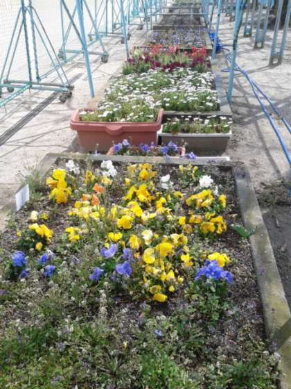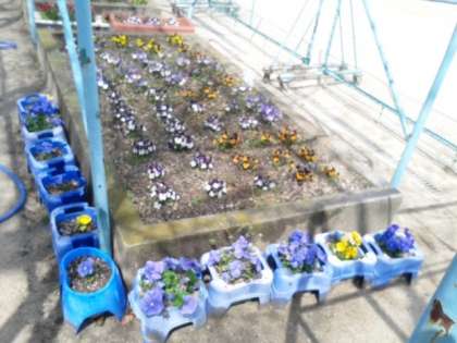 10月に「花の輪運動」で届いた花(ビオラ・ノースポール・パンジー・キンギョソウ)が学習園できれいに咲いています。ここ数日の温かさもあって、いっきに咲き出しました。いよいよ春本番といった感じです。
