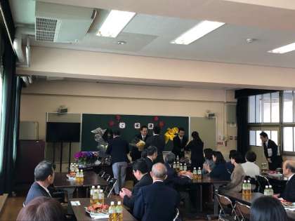 お別れの会終了後には、多目的室において、教頭の離着任式を行いました。九条南連合振興町会会長の仁熊様、PTA会長中山様、社会福祉協議会会長村井様から、温かい激励のお言葉をいただきました。ご多用な中、お運びいただきました皆様本当にありがとうございました。今後とも本校の教育活動へのご理解・ご協力を引き続きお願いいたします。