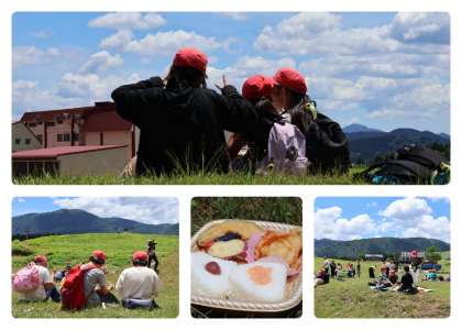 避難訓練を終えて、お弁当食べています。高原はとても爽やかです。