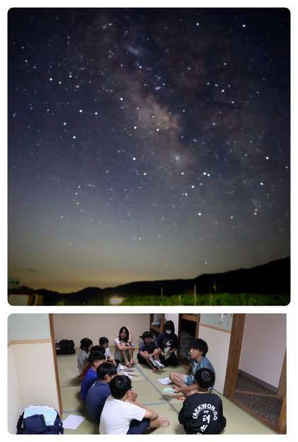 満天の星空を堪能して、子どもたちは就寝準備にかかりました。天の川、夏の大三角、さそり座、北斗七星などが観察できました。流れ星や人工衛星も観ることができました。子どもたちは、普段観ることができない満天の星空を目にして、宇宙の神秘を感じたのではないでしょうか。