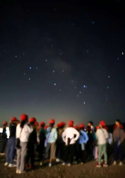 ナイトハイクを終えて、宿舎前の広場に戻ってきました。今日もいい天気で、空一面に広がる星空が子どもたちを出迎えました。今日も星空を眺めながら、少しばかり天体についての学習。子どもたちの科学への感心が深まればいいなと感じながら、星空についての話をしました。