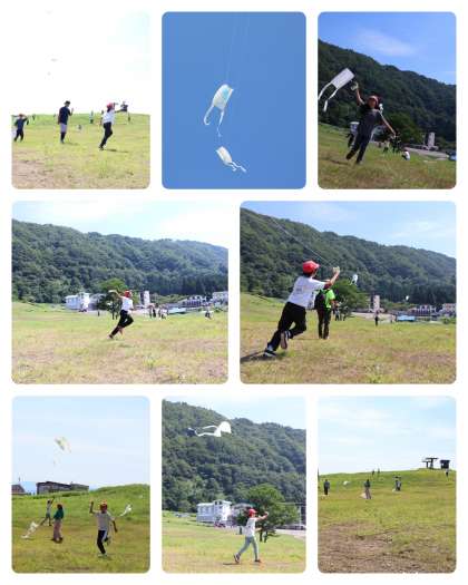 朝食を終えて、部屋の大掃除をしました。次は凧揚げです。朝から風がなく、凧がどれだけ揚がるか心配でしたが、子どもたちが高原に行くと風が吹いてきました。今年の子どもたちは、本当に天候に恵まれています。高く上がったものは、20mくらいの高さまで上がりました。
