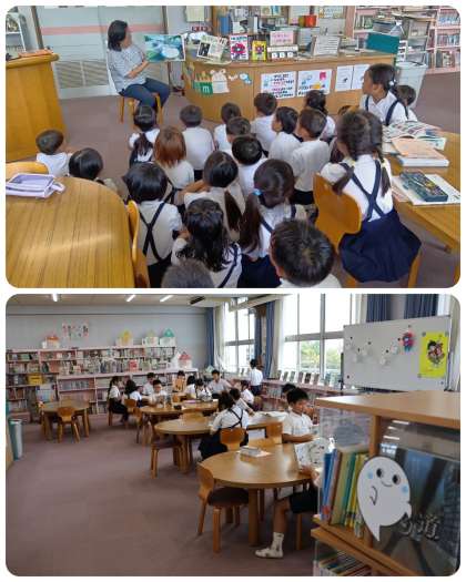 時には読み聞かせで子どもたちを楽しませています。休み時間には、読書ボランティア「よもよも」さんも読み聞かせをしてくださっています。
