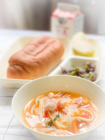 トマトのスープスパゲッティは、チキンバイヨンをベースにトマトを加えたもので、トマトが苦手と感じる子もあまり気にならずに食べられる絶妙な味付けです。なしは、7月から10月が旬。国産の二十世紀なしが提供されています。