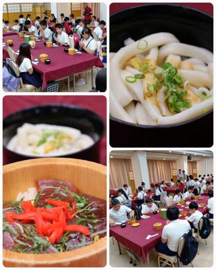 神宮会館に到着。昼食をいただいています。昼食のメニューは、伊勢名物のてこね寿司と伊勢うどんです。てこね寿司のカツオを残している子がちらほらいますが、概ねよく食べています。とても美味しいと喜んでいる子もいました。