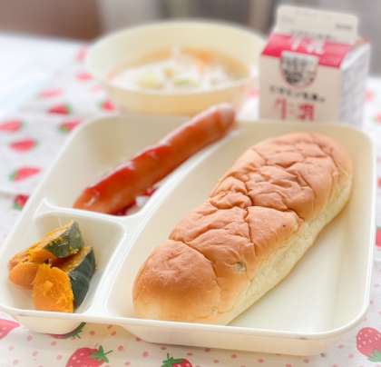 今日の献立は、おさつパン、ウインナーのケチャップソース、スープ、焼きかぼちゃ、牛乳です。
