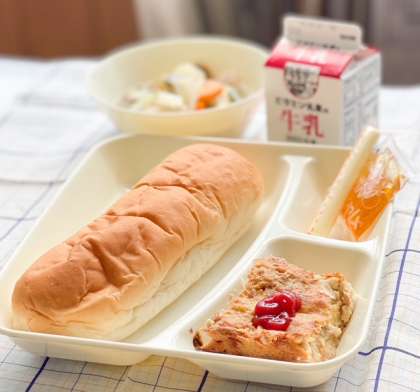 とうふローフは、ツナととうふを中心に、たまねぎや大豆などを加えて蒸し焼きにしたものです。卵を使っていませんが具沢山の卵焼きに似た食感で、ケチャップがとてもよく合います。洋風の献立は、コッペパンによく合います。