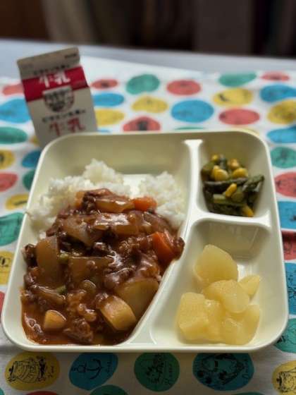 ハヤシライスは、子どもたちに大人気のメニューです。牛肉、ジャガイモ、玉ねぎ、ニンジンに加え、グリーンピースやセロリも入った具沢山なハヤシライスでした。少し気温が上がったお昼の時間ですが、しっかりと食べきることができました。