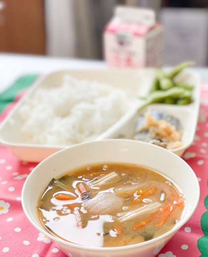 今日の献立は、ごはん、さごしのみぞれかけ、かぼちゃのみそ汁、えだまめ、牛乳です。秋から冬が旬の「かぼちゃ」を使ったお味噌汁。少し甘味があって、とても美味しいです。えだまめも、春と秋が旬となっていて、秋の恵みを堪能できる献立となっています。