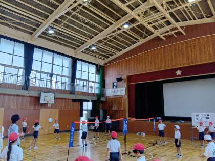 4年生は、体育でソフトバレーボールを行っています。4年生が取り組みやすいように、ルールを工夫して行っています。3人ひとチームで、キャッチ→パス→パス→アタックの順にラリーを続けていきます。それぞれのチームが声をかけ合いながら得点を決めることができるように頑張っていました。