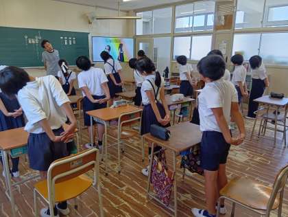 先週はしせい週間でした。それぞれの曜日で、「腰骨を伸ばして座ろう」などのしせいに関する目標があり、それを意識して過ごすというものです。1日の終わりには、タブレットで振り返りを行いました。写真は、しせいストレッチの様子です。よい姿勢で過ごすことを意識化するためのストレッチです。健康委員会の児童が作成した動画を見ながら、各クラスで取り組みました。
