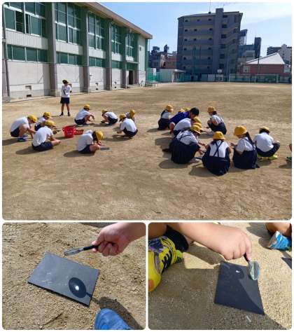 3年生は、理科で「光のせいしつ」の学習をしています。今日は、日光を集めたときの明るさとあたたかさの学習をしました。虫眼鏡を黒い紙に近づけて、明るさを調べたり、紙の様子を調べたりしました。子ども達は、日光を集めたところを小さくするほど、明るく、あつくなることに気づいたようです。
