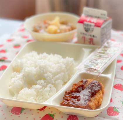 今日の献立は、ごはん、みそカツ、じゃがいもと野菜の煮もの、焼きのり、牛乳です。
