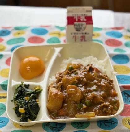 今日の献立は、ポークカレーライス、ほうれん草のソテー、黄桃(缶)、牛乳です。