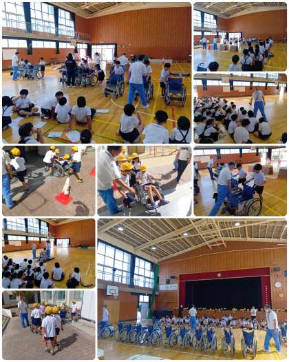 今日は、大阪市立心身障がい者リハビリテーションセンターの方々に来ていただき、車いす体験学習を行いました。
