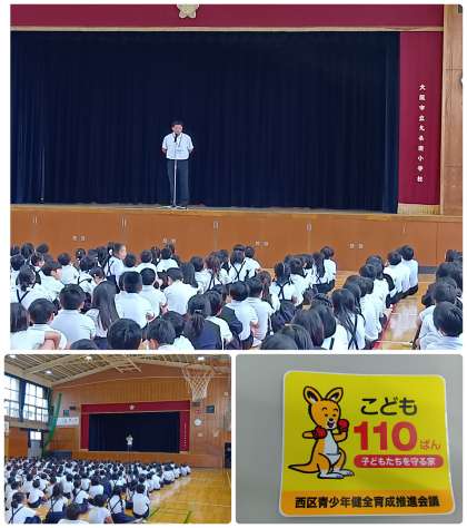 今日の全校朝会では、校長先生から防犯についてのお話がありました。九条南の地域では、子ども達の安全のために地域の方や区役所の方、警察の方が見回りをしてくれています。ただ、それだけではなく、自分で防犯について意識することも大切です。人気のないところに行かない、1人で行動しないなど、自分にできることはたくさんあります。それらを「意識」するだけでも安全性はぐっと高まります。また、地域には写真のような「子ども110番の家」もあります。万一の時のためにも、場所を常日頃から確認しておき、活用してください。
