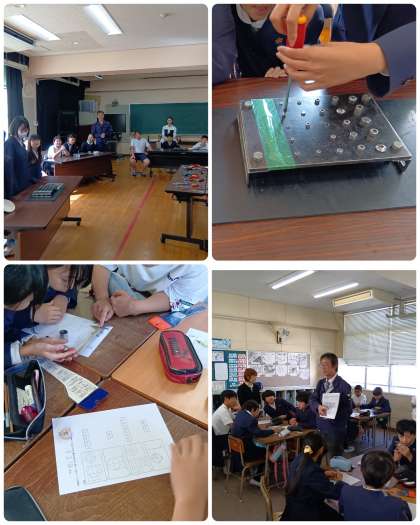 九条の町の基幹産業であるねじを生かすための工具について、実際に使いながら学んでいきました。星形や六角など、あまり見かけない形のものもあり、それに合う工具を探して、上手に締めたり外したりしていきました。たくさんの工具の中から、うまく合うものを見つけるのは大変でしたが、グループで役割分担しながら、安全に取り組むことができました。