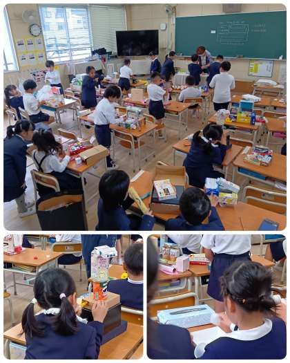 1年生は、おうちから持ち寄った材料を使って工作をしています。子どもたちの発想は豊かで、大人が考えないようなユニークなアイデアが飛び出します。例えば、トイレットペーパーの芯は、子どもたちには電車の車輪であったり、建物の柱だったり、いろいろなものに見えるようです。最適な材料を探す目はキラキラとしていて、楽しみながら活動している様子が伝わってきます。作品の完成が、とても楽しみです。