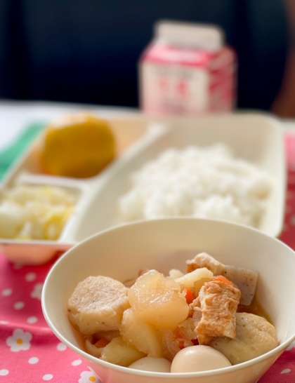 ホッコリ温かい関東煮、少し肌寒さを感じることもあるこの時期に、ちょっと嬉しい献立です。具沢山で野菜もしっかり摂ることができます。今日も美味しくいただきます。