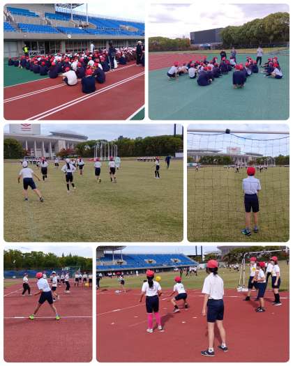 6年生は、長居公園(ヤンマースタジアム長居、ヤンマーフィールド長居)に来ています。今日は西区の小学校が集まり、スポーツ交歓会に参加しています。