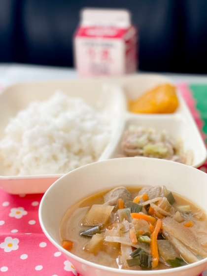 今日の献立は、ごはん、豚肉と野菜のいためもの、いわしのつみれ汁、かぼちゃういろう、牛乳です。