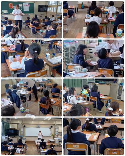 学校歯科医と歯科衛生士の先生を迎えて、歯みがき指導を受けました。これは、歯や口の健康上の問題を発見し、解決方法を自ら考え、実践していく力を身につけることを目的に実施されています。