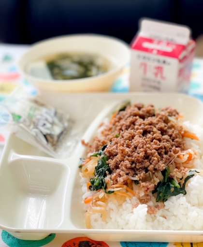 今日の献立は、ビビンバ、わかめスープ、ミニフィッシュ、牛乳です。