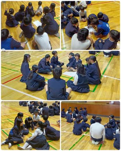 昨日の児童集会は、「学校クイズ」でした。学校に関するクイズが出題され、答えが何かをたてわり班で考えました。知っているようで知らないクイズもあり、子ども達は「あれ何やったけ?」と頭をひねりながら考えていました。