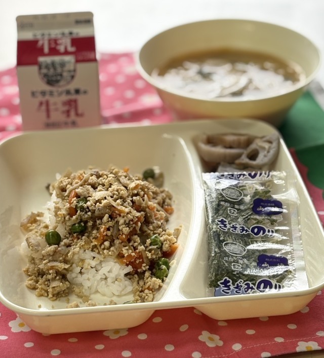 今日の献立は、鶏ごぼうご飯、みそ汁、焼きれんこん、牛乳でした。