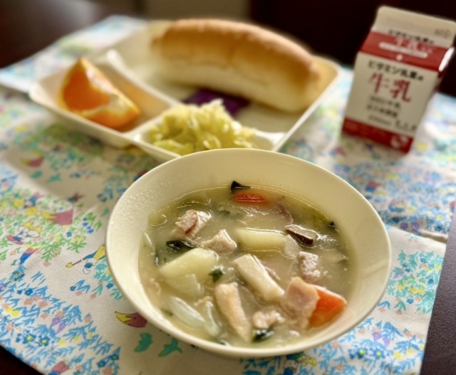 2/12の献立は、コッペパン、鶏肉とほうれんそうのシチュー、キャベツとコーンのサラダ、デコポン、ブルーベリージャム、牛乳でした。