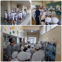 はじめての給食に1年生はドキドキワクワク♪6年生から配られた給食を見て、「美味しそう」と声をあげていました。みんなたくさん給食を食べていました。明日からの給食も楽しみですね♪