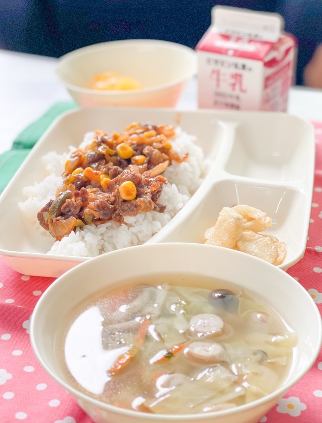 今日の献立は、卒業お祝い献立です。ビーフケチャップライス、フライドポテト、キャベツのスープ、ダイスゼリー(みかん)、牛乳でした。ビーフケチャップライスは、ご飯によく混ぜていただきます。ケチャップ風味ですが、ほのかに香るカレー風味も効いていて子どもたちに人気です。卒業式まで後僅か。6年生は、残り少ない小学校生活を楽しんで欲しいですね。