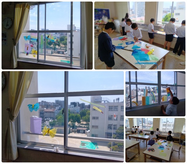 4年生では、図画工作科の時間に「まどを開いて」という教材で作品を作りました。窓から見える景色に何かを加えてみることをめあてにし、スズランテープや花紙を使って様々な模様を作りました。実際に窓に貼ってみるととても綺麗で、いつもの景色に彩りが加えられました。