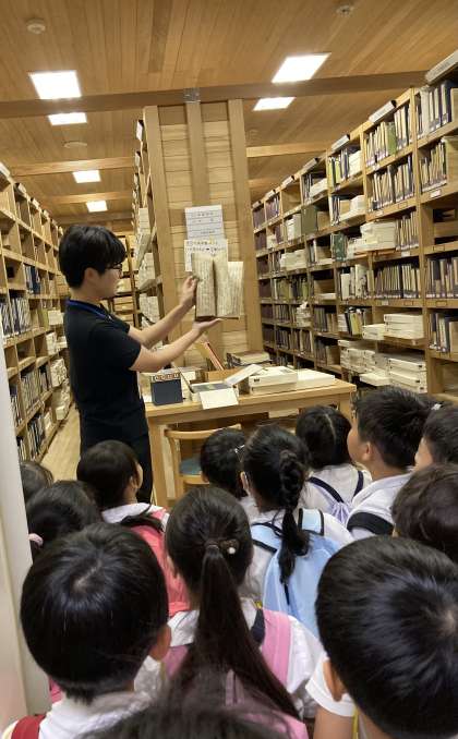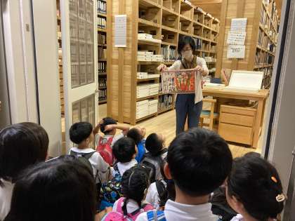 あっという間に図書館へ到着。図書館では、普段は入ることができない書庫にも入らせてもらいました。たくさんの本が並んであり、「本のにおいがする!」と体全体を使って学ぶことができました。図書館の広さは、京セラドーム何個分か覚えているかな!?