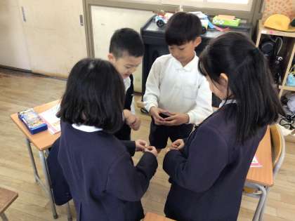 地域の方に先生となっていただき、糸電話とぶんぶんゴマを作りました。穴をあけ、糸を通しておもちゃを作りました。わからないことは、教えていただきながら、友だちと協力し合いながら作り上げていきました。できた糸電話で、友だちと話してみて「聞こえる?」「聞こえた!」という声も聞こえてきました。また、ぶんぶんゴマに絵をかいて「きれいだな」と絵が回転してできる模様に感心する姿も。