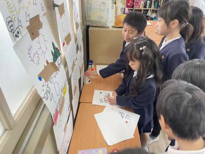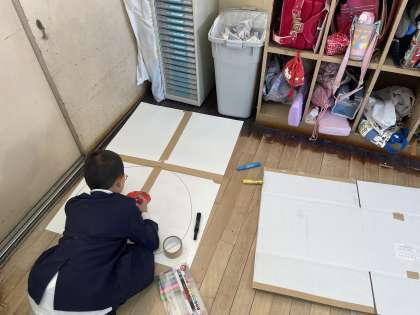 自分たちで作った動くおもちゃで1年生に楽しんでもらう「おもちゃランド」を開くため看板やルールをまとめたものを作っています。