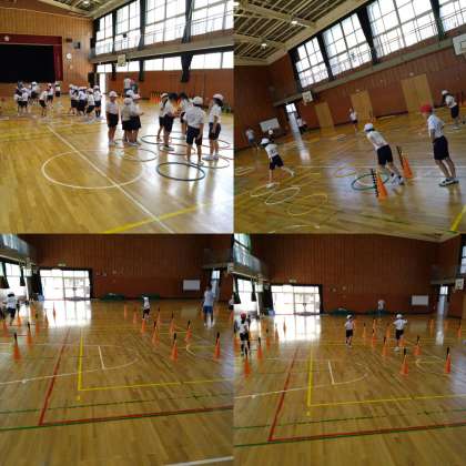 3年生の体育科では、今日から「ミニハードル走」が始まりました。今朝の雨で運動場が使えなかったので、講堂で行いました。9マス鬼ごっこや島わたり、コーンハードルの練習を行いました。みんな汗をたくさんかきながら、とても楽しそうに取り組んでいました。