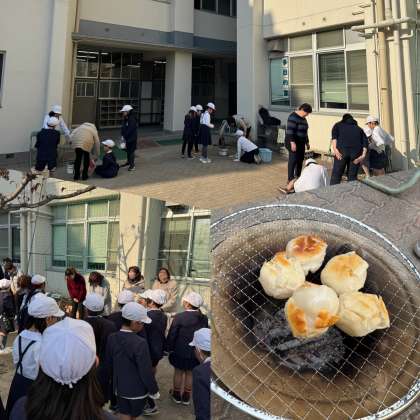 今日は、地域の女性部の方々や保護者の方にご協力いただき、七輪を使ってお餅を焼く体験をしました。3年生は、社会科で「大阪市のうつりかわり」の学習をしています。その学習の中で、昔の人が使っていた道具についての学習をします。今日は、その学習の一環として、七輪体験をしました。