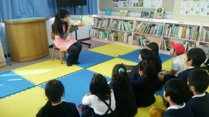 20分休みに「よもよもお話会」がありました。今日はお天気がよく、運動場で遊ぶ子どもたちが多かったでが、図書室にもお話を聞きたい子どもたちが集まってきました。