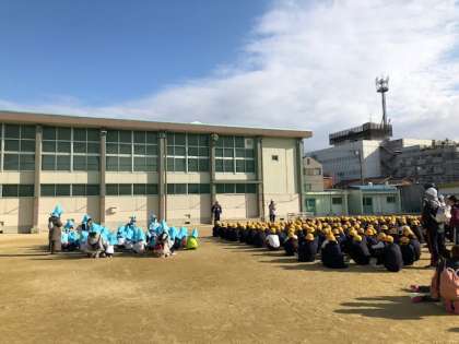 福音幼稚園の園児約70名と全校児童が運動場に避難し、校長先生や避難訓練担当の先生の話を聞きました。校長先生からは、「災害が起きたときは、慌てずに落ち着いて行動することが命を守ることにつながる」、「実際、災害が起こったときは幼稚園の人だけでなく、地域の人も避難してくるので、その時は小学生も救助の手伝いをすることになる」などのお話がありました。