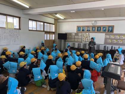 その後、2次避難(津波発生を想定)で校舎4階に全員避難しました。幼稚園児は6年生と一緒に4階音楽室に避難しました。6年生は小さな園児に合わせて、慎重にあわてず避難していました。園児のみんなも、おしゃべりすることなく6年生の言うことを聞きながら避難できていました。