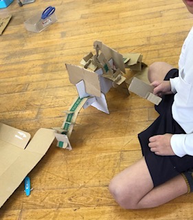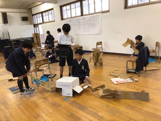 3年生は図画工作科で段ボールを使って工作をしました。題して「クミクミックス」。