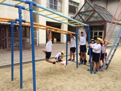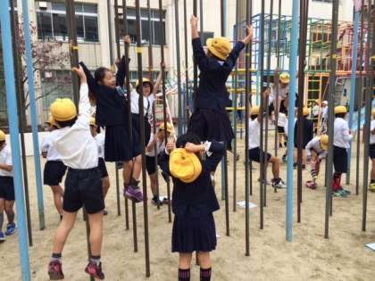 体育の授業で鉄棒に取り組んでから、休み時間も校庭の鉄棒コーナーには子どもたちの姿が見られています。1学期は鉄棒に飛び乗って自分の体を腕で支えることが難しい児童が多かったですが、毎回の体育の時間や休み時間の練習タイムで、しっかり鉄棒につかまり、できる技が増えてきたことが嬉しく、自信につながっている様子です。登り棒にも挑戦し、一番上の鈴を鳴らせるように挑戦中です。両手でつかまって腕の筋肉も鍛えています!