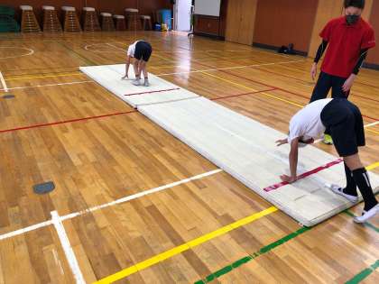 2・3時間目に西屋内プールからインストラクターの方が2名来てくださり、マット運動を指導していただきました。前転・後転の基本的な方法を分かりやすく教えてくださいました。来週は、跳び箱運動を教えてくださる予定です。