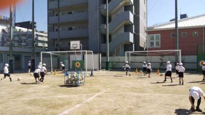 3年生の体育は、4分間走とサッカーをしています。サッカーといっても試合はまだできません。ボールをけったり止めたり、足でボールを自由にコントロールする練習です。もっともっとボールと仲良くなれるといいですね。がんばれ3年生。