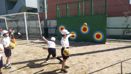 先日から、1年生は運動場の体育では、運動コーナーを設定し、ボールを蹴る、ボールを投げる、フープを使った技、ミニハードル、ジグザグ走りなどに取り組んでいます。