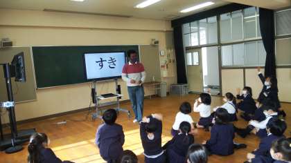 先週、久しぶりにモリス先生の外国語活動がありました。今回は、野菜や果物の名前と、それぞれの単数形・複数形を練習しました。昨年から2年続けて九条南小学校の担当なので、一人一人の名前もしっかり覚えてくださっています。授業の後、4年生の子たちは理解するのが早く、「すばらしい!」とほめていただきました。モリス先生との学習も、いよいよ残すところ1回です。