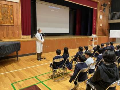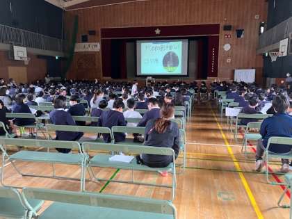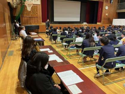 体育館で全校児童、学校医、学校薬剤師、PTA保健給食委員会の皆様が参加して、「よいしせいですごそう」をテーマに学校保健委員会を開催しました。 -