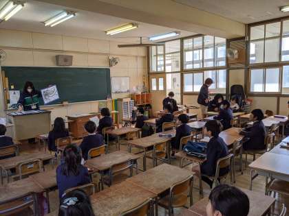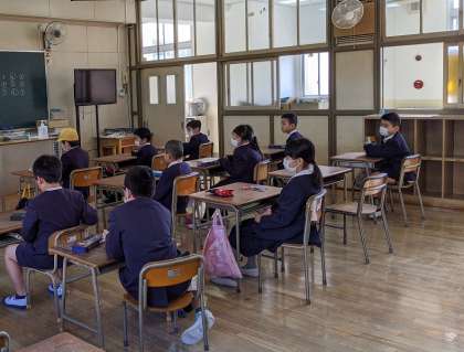 1クラスの人数が多い学年では、2教室に分かれ、窓もあけ放ち、机の間も少し開けて集合です。友達の顔を見て子どもたちの楽しそうな元気な声が聞こえてきます。