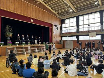 作文発表では1年生と5年生の代表児童が1年間の振り返りと次年度の抱負を発表しました。1年生の児童は「思い出」について、5年生の児童は「様々な学校行事から学んだこと」を堂々と発表していました。全校児童から大きな拍手が送られました。